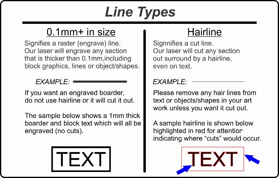 Line types are very important in laser engraving world. Simply put, a hair line will "cut", and any thing else will "engrave". Please check your artwork very carefully for stray hairlines as there is nothing worse than receiving your job back with a bunch of cut out letters that were not supposed to be cut out! Our diagram helps to explain this concept in more detail.